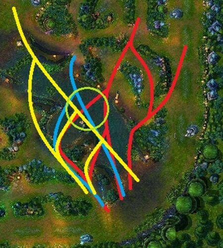 今回はBot側のワーディングについて考察したいと思う。 この画像は青チーム側から見た、 敵Junglerが本陣からBot側へGankする際のルートを赤線で示したものだ。 (自由にBlinkできる仮定:例:Vi、Graves、Zac、Shaco、J4。Sejなど) (レーンから真っ直ぐに…